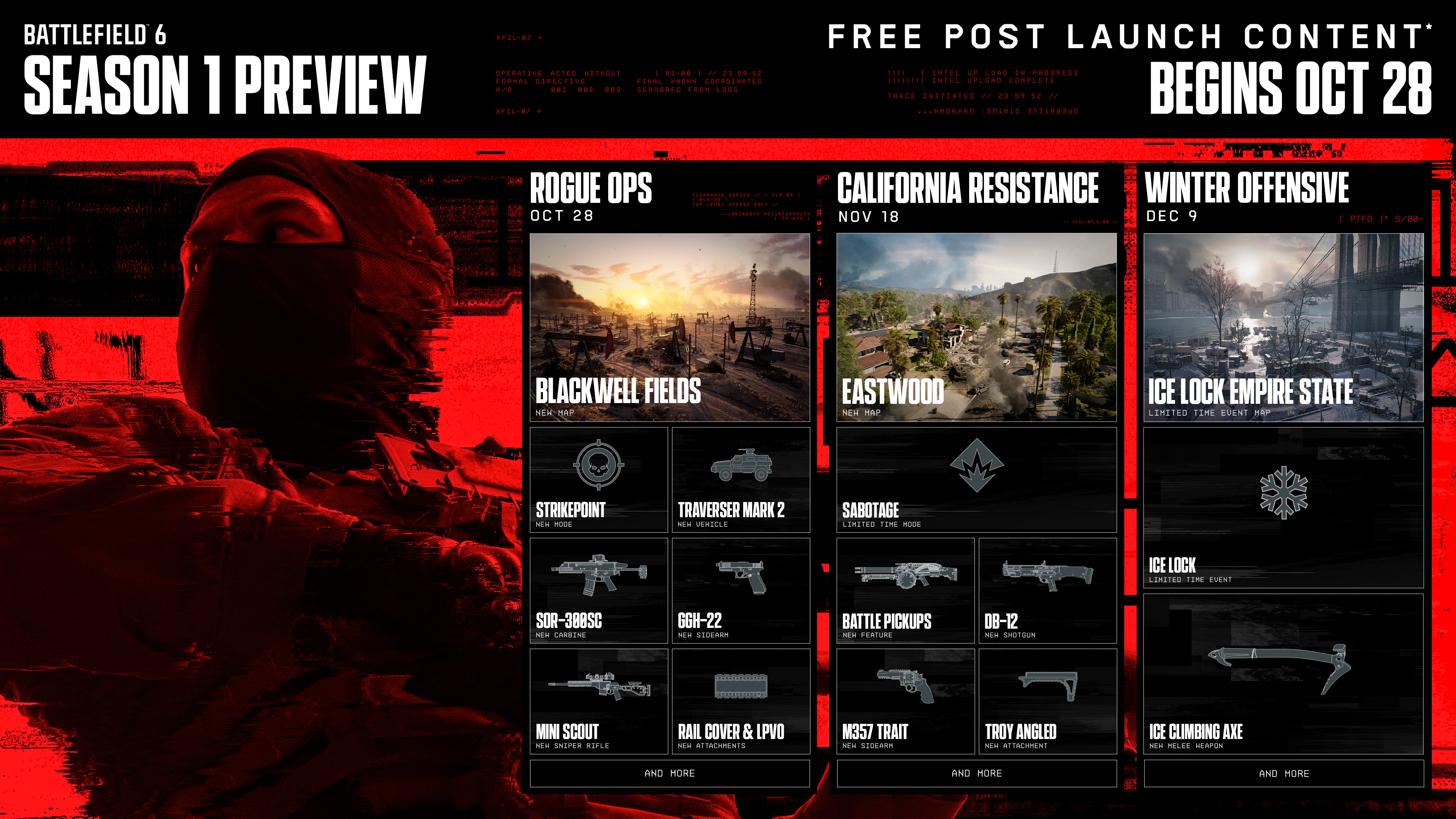 * La primera fase llega con el mapa Blackwell Fields, un escenario abierto para combates con vehículos terrestres y aéreos. Además, se estrena Strikepoint, un modo táctico 4v4 con rondas rápidas y sin reapariciones.