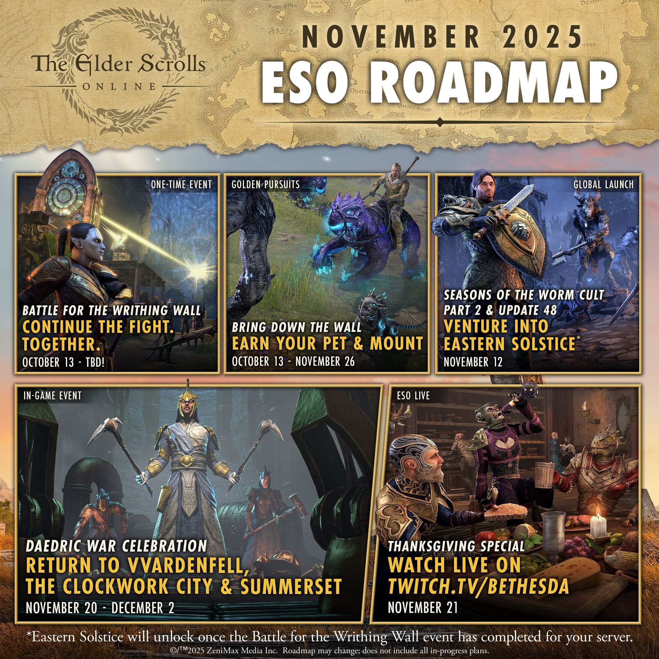 * Este noviembre en TESO promete ser uno de los meses más completos del año. Oro, eventos temáticos, regiones nuevas y grandes recompensas te esperan en Tamriel.